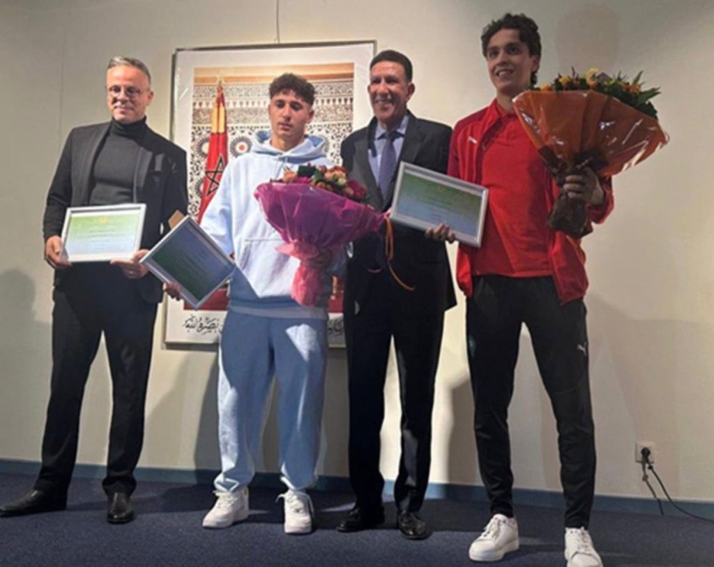 وشهد الحفل حضور مدرب المنتخب الوطني محمد وهبي، إلى جانب عدد من لاعبي نادي أندرلخت البلجيكي الذي يلعب له الثنائي المغربي، إضافة إلى أفراد من الجالية المغربية المقيمة في بلجيكا، الذين تفاعلوا مع هذا التكريم الذي يجسد الاعتزاز بالهوية المغربية.